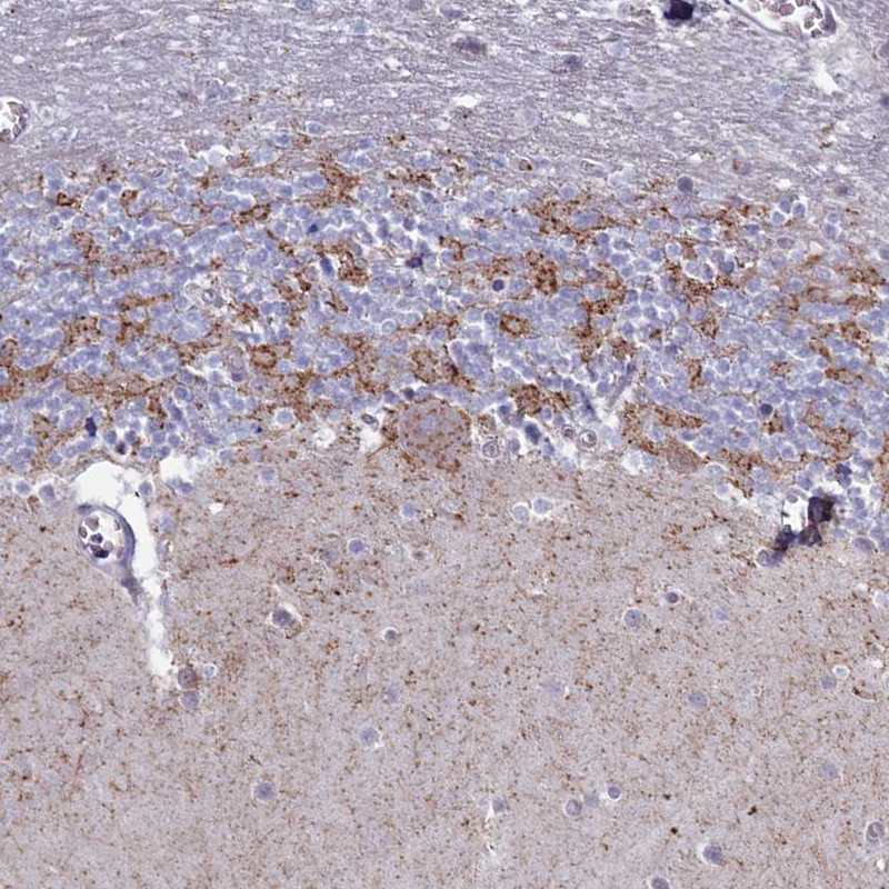 Immunohistochemical staining of human cerebral cortex shows moderate granular cytoplasmic positivity in neuropil.