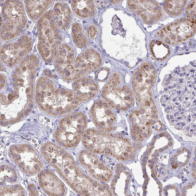 Immunohistochemical staining of human cerebellum shows strong positivity in neuropil.