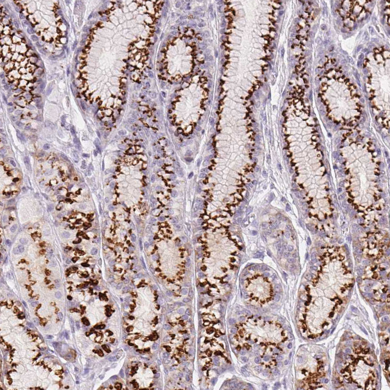 Immunohistochemistry analysis in human stomach and liver tissues using HPA065317 antibody. Corresponding GALNT7 RNA-seq data are presented for the same tissues.
