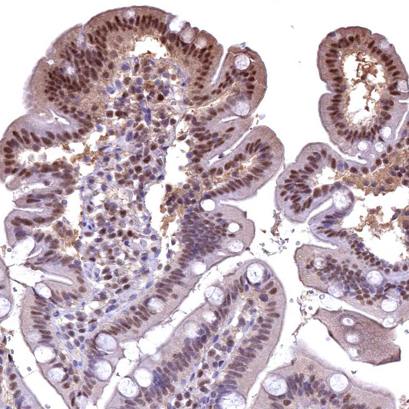 Immunohistochemical staining of human skeletal muscle shows moderate nuclear and cytoplasmic positivity in myocytes.