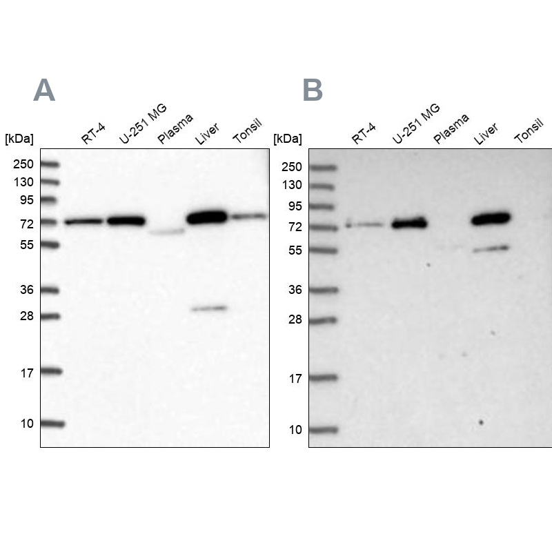 Immunohistochemical staining of human colon, kidney, liver and testis using Anti-GBE1 antibody HPA038074 (A) shows similar protein distribution across tissues to independent antibody HPA038075 (B).