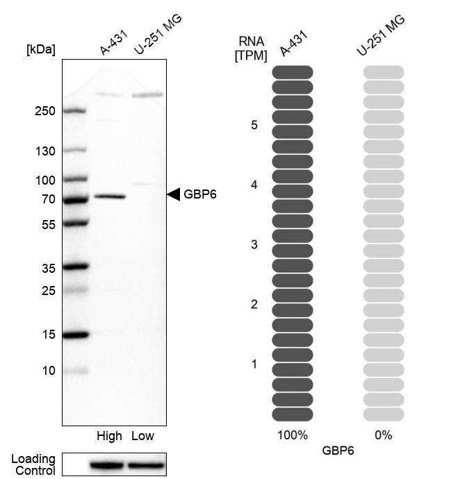 Immunohistochemistry analysis in human esophagus and colon tissues using HPA027744 antibody. Corresponding GBP6 RNA-seq data are presented for the same tissues.