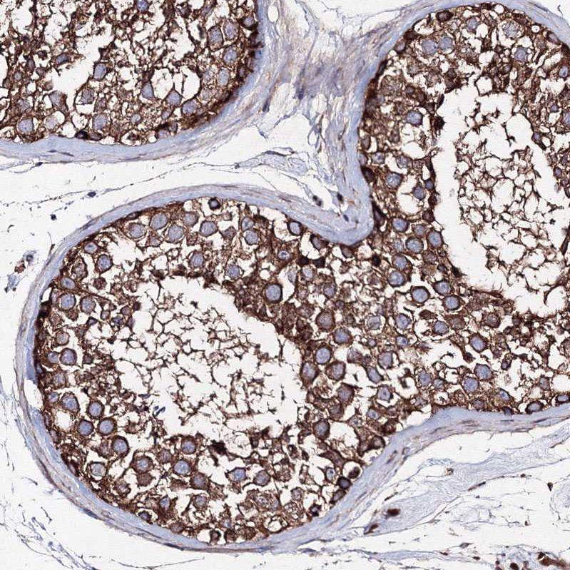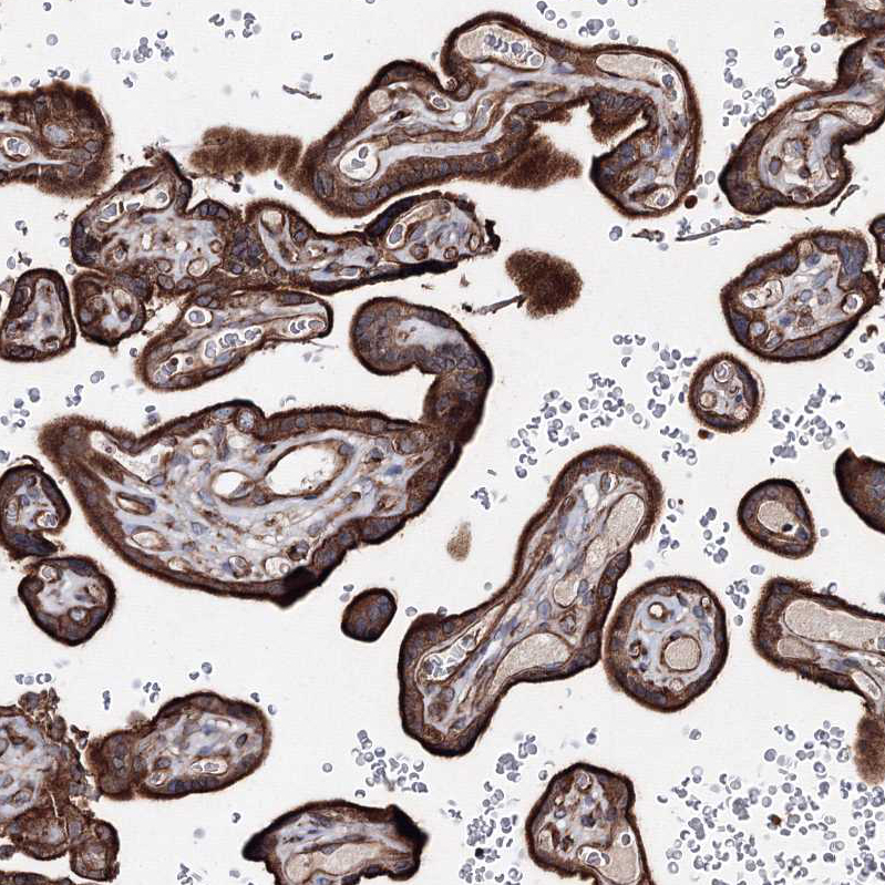 Immunohistochemical staining of human kidney, placenta, stomach and testis using Anti-GFM1 antibody HPA034764 (A) shows similar protein distribution across tissues to independent antibody HPA034765 (B).