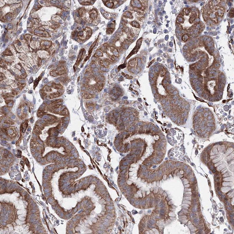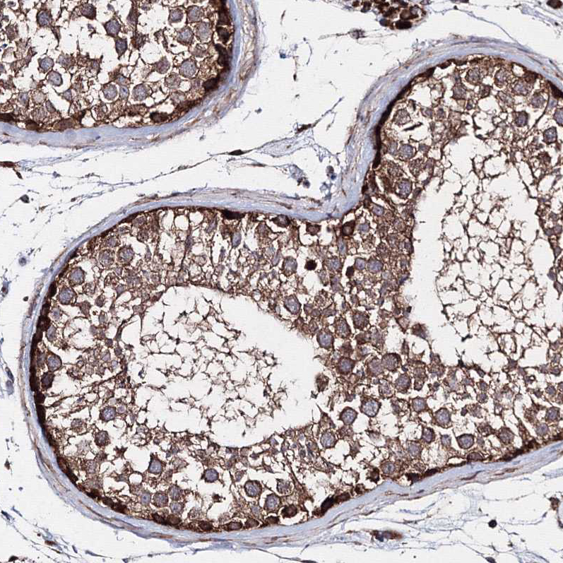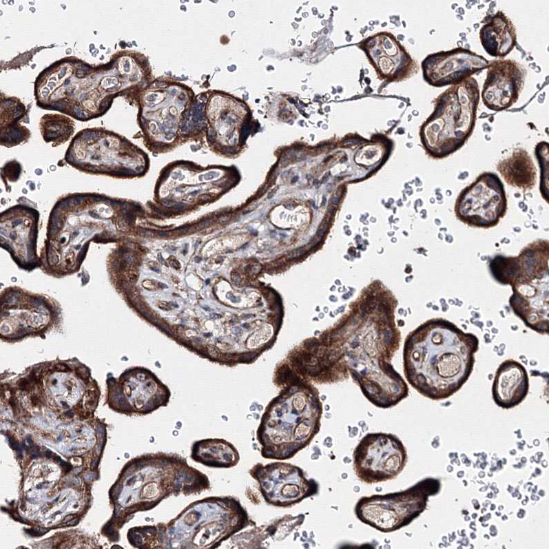 Immunohistochemical staining of human kidney, placenta, stomach and testis using Anti-GFM1 antibody HPA034765 (A) shows similar protein distribution across tissues to independent antibody HPA034764 (B).