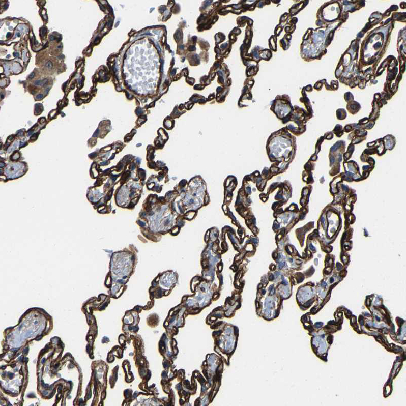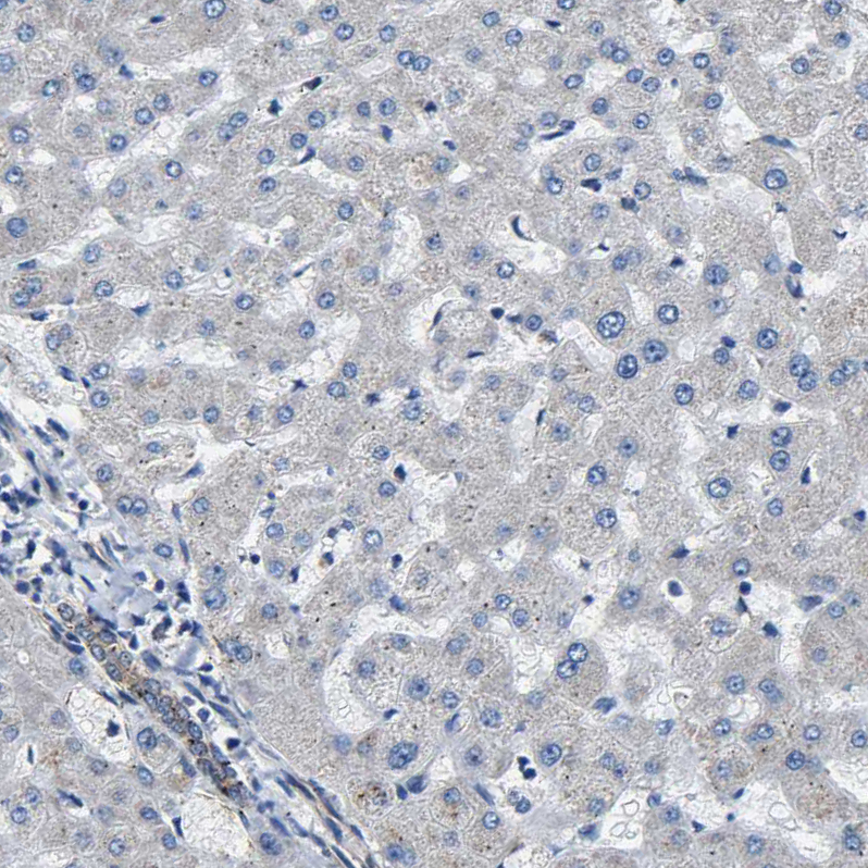 Immunohistochemical staining of human testis shows strong cytoplasmic positivity in cells in seminiferous ducts.