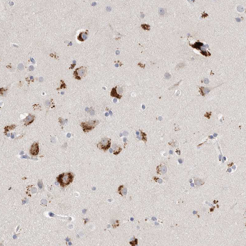 Immunohistochemical staining of human kidney shows strong granular cytoplasmic positivity in cells in tubules.