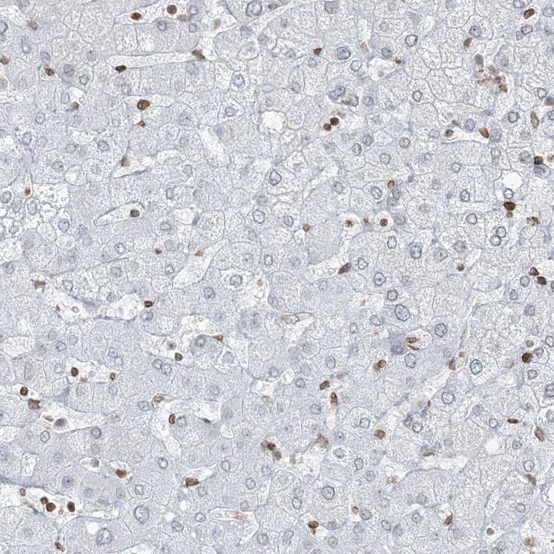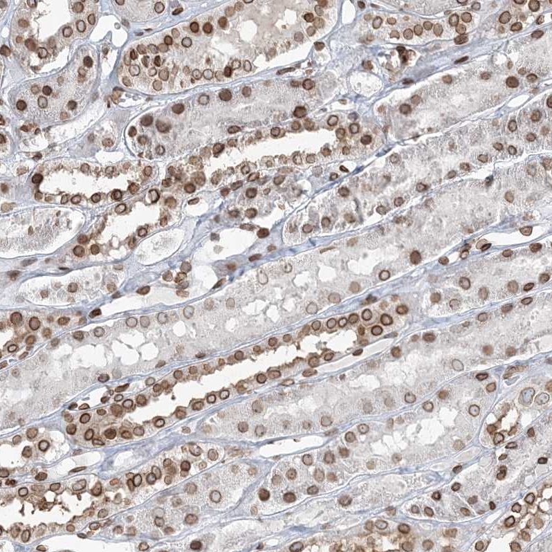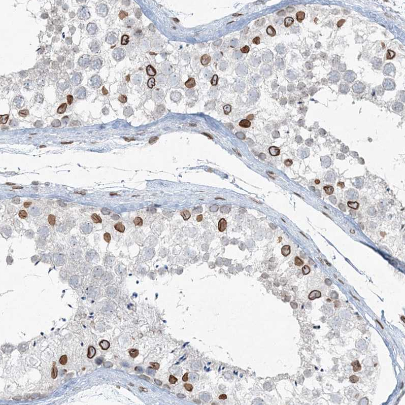 Immunohistochemical staining of human cerebral cortex shows strong positivity in nuclear membrane in neuronal cells.