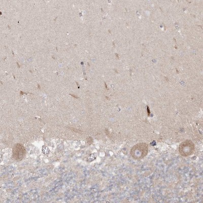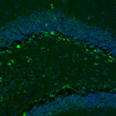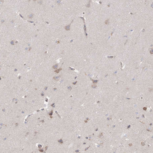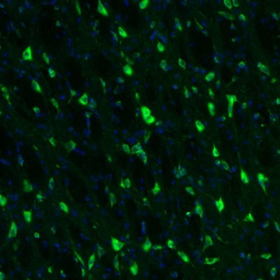 Immunofluorescence staining of mouse periaqueductal grey shows immunoreactivity in neuronal cell bodies.