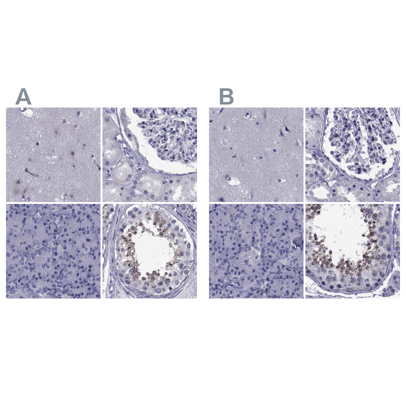 Immunohistochemistry analysis in human testis and pancreas tissues using Anti-GKAP1 antibody. Corresponding GKAP1 RNA-seq data are presented for the same tissues.
