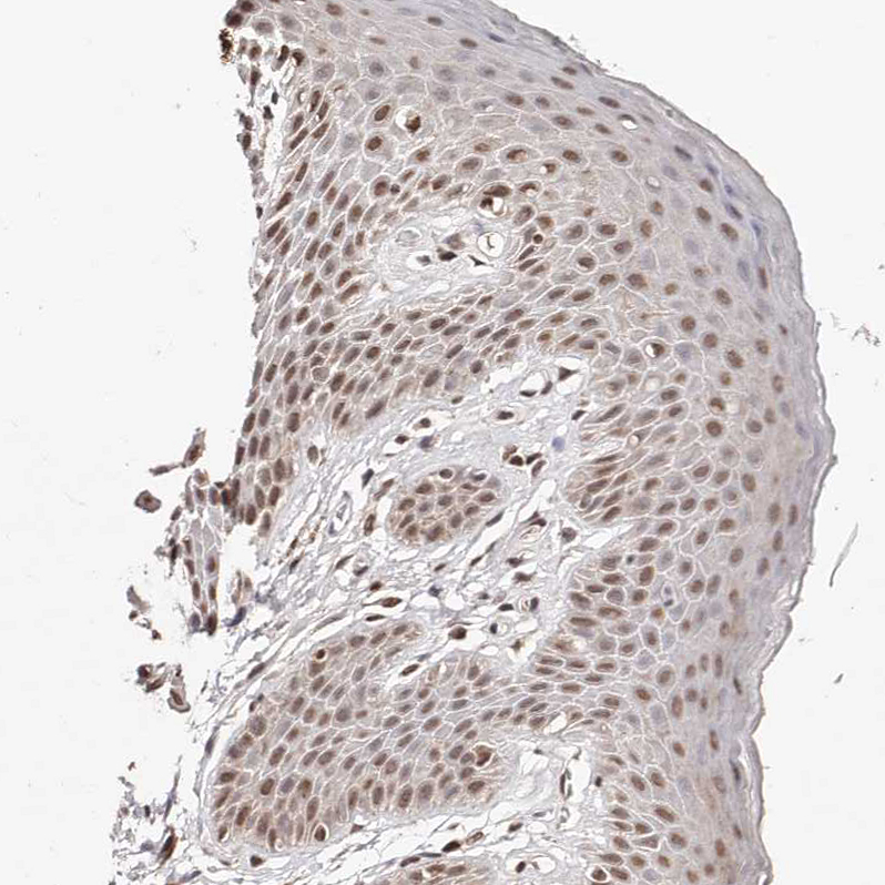 Immunohistochemical staining of human cerebellum shows moderate nuclear positivity in Purkinje cells.
