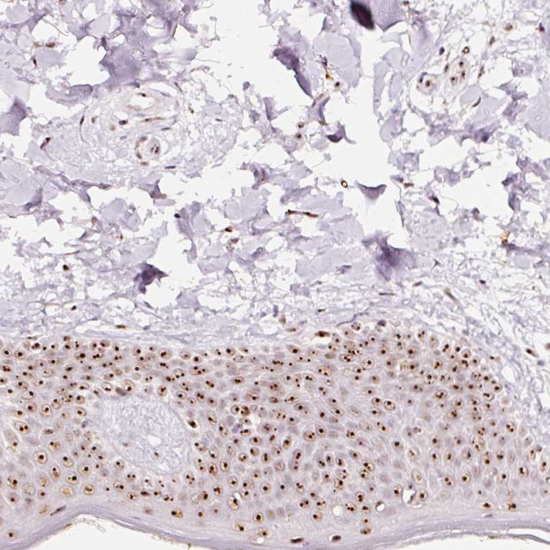 Immunohistochemical staining of human kidney, liver, skin and tonsil using Anti-GNL3 antibody HPA036742 (A) shows similar protein distribution across tissues to independent antibody HPA036743 (B).