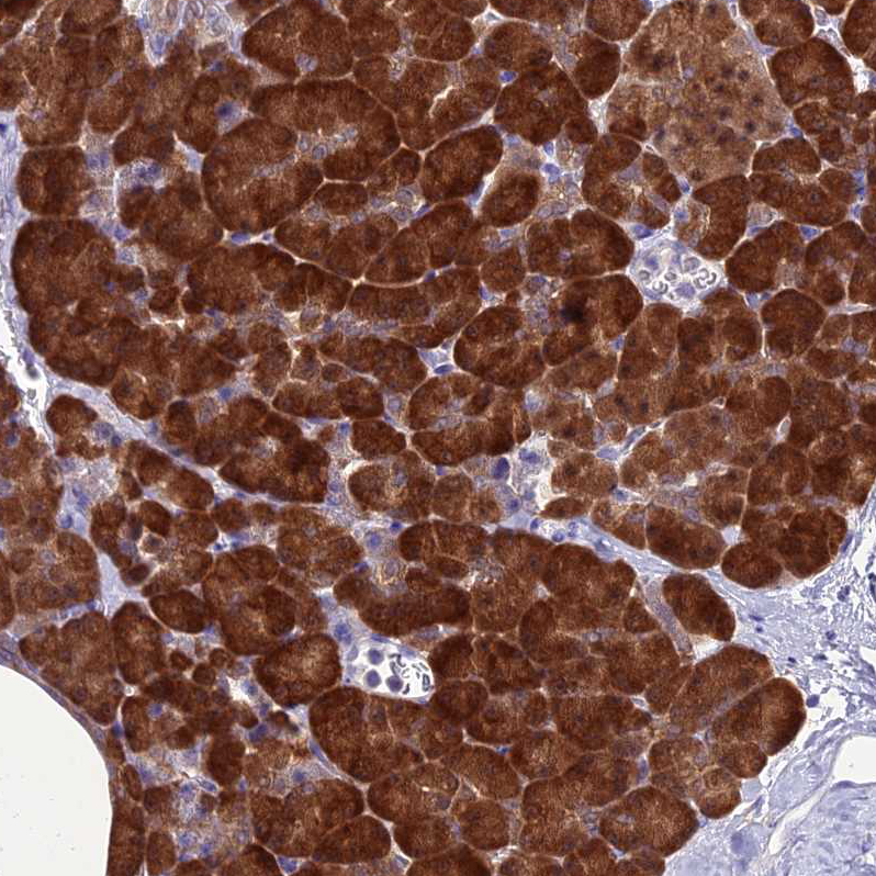Immunohistochemical staining of human liver shows strong cytoplasmic positivity in hepatocytes.