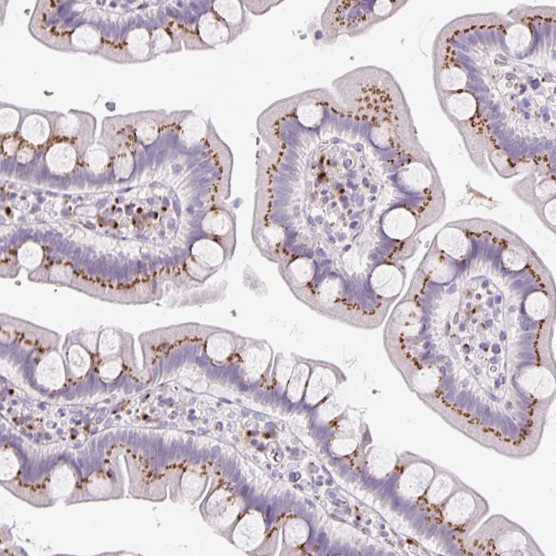 Immunohistochemical staining of human epididymis shows strong cytoplasmic granular positivity in glandular cells.