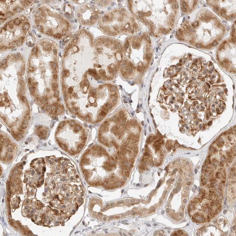 Immunohistochemical staining of human kidney shows strong cytoplasmic positivity in cells in tubules and cells in glomeruli.
