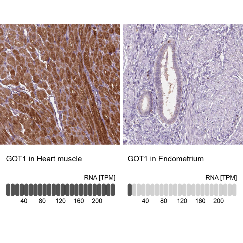 Immunohistochemistry analysis in human heart muscle and endometrium tissues using HPA072629 antibody. Corresponding GOT1 RNA-seq data are presented for the same tissues.