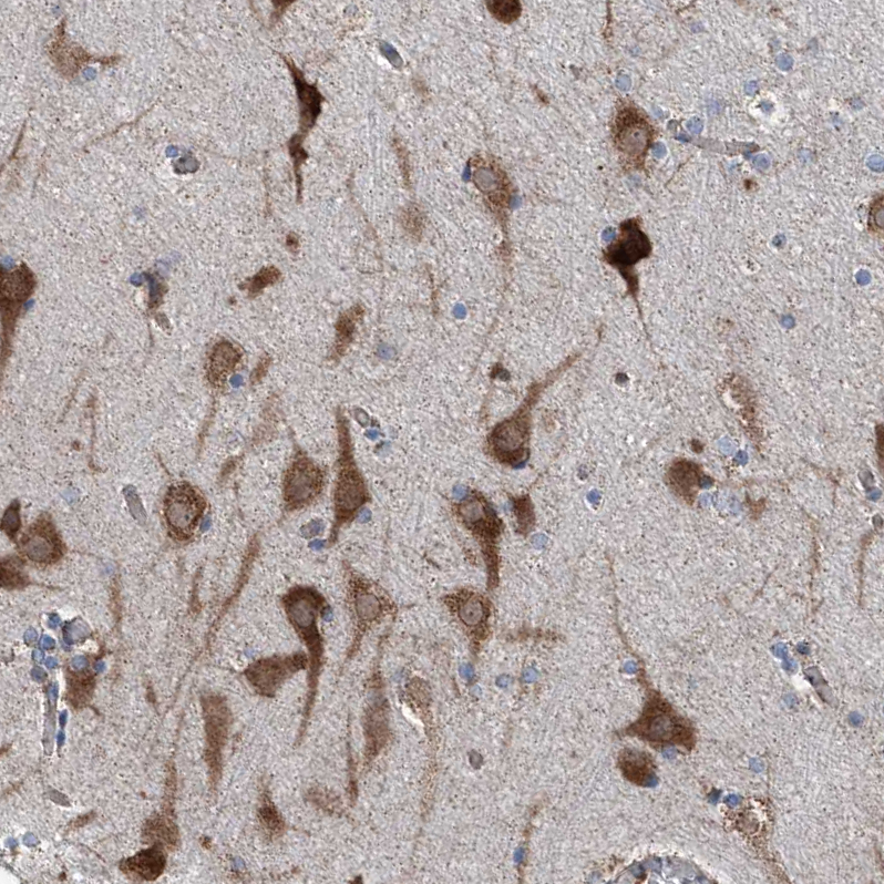 Immunohistochemical staining of human kidney shows strong cytoplasmic positivity in cells in tubules.