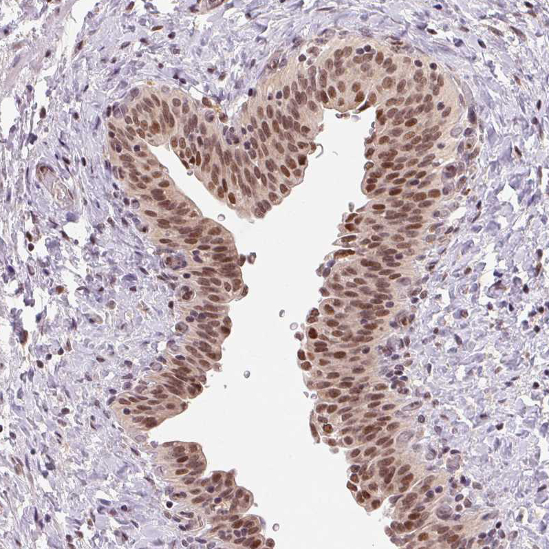 Immunohistochemical staining of human skin shows moderate nuclear positivity in squamous epithelial cells.