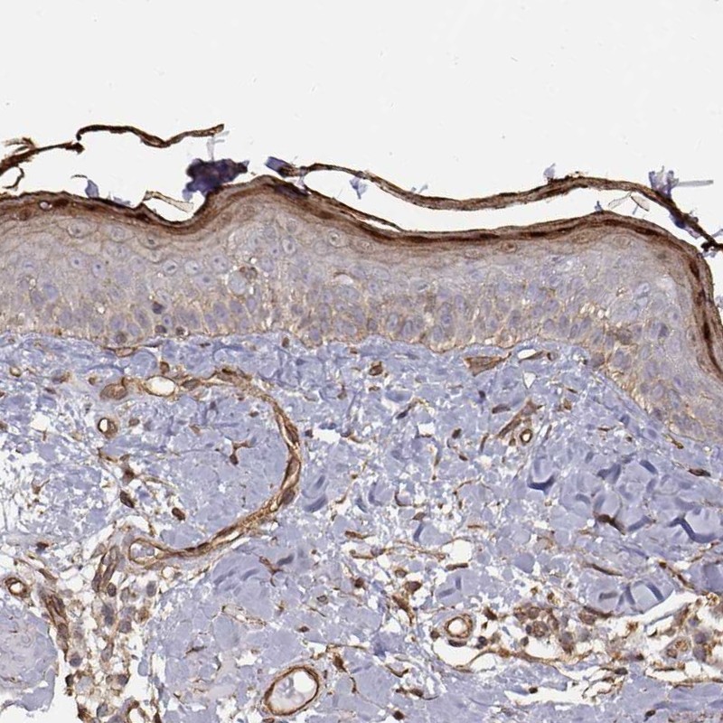 Immunohistochemistry analysis in human skin and pancreas tissues using Anti-GSDMA antibody. Corresponding GSDMA RNA-seq data are presented for the same tissues.