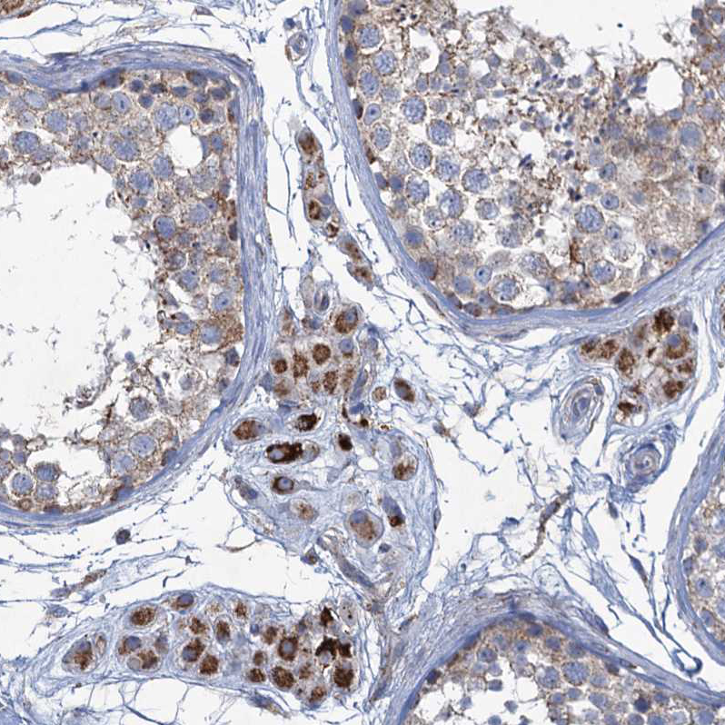 Immunohistochemical staining of human cerebral cortex shows strong cytoplasmic granular positivity in neurons.