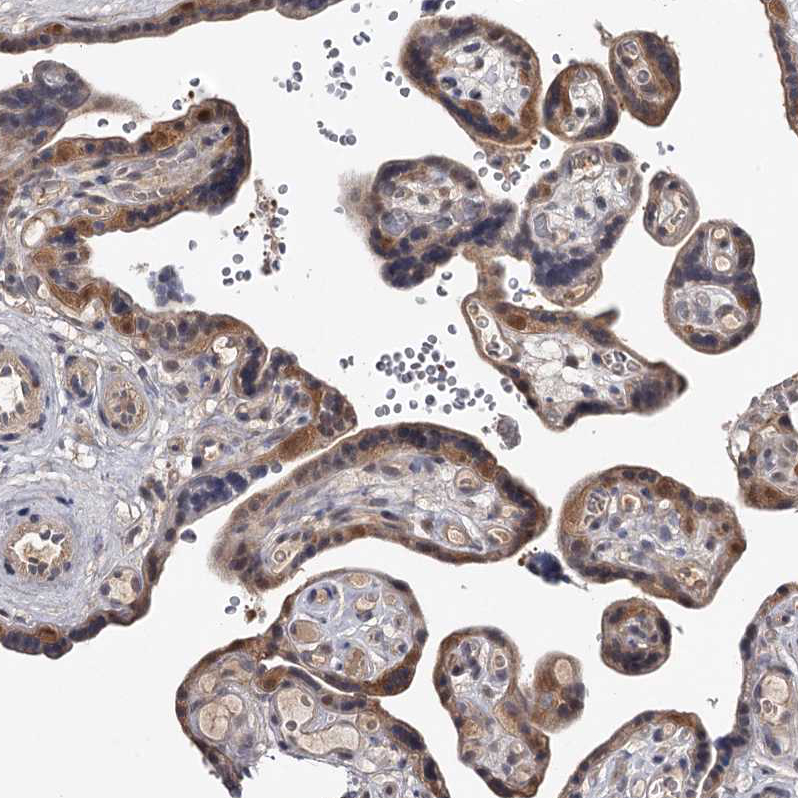 Immunohistochemical staining of human testis shows strong cytoplasmic positivity in cells in seminiferous ducts.