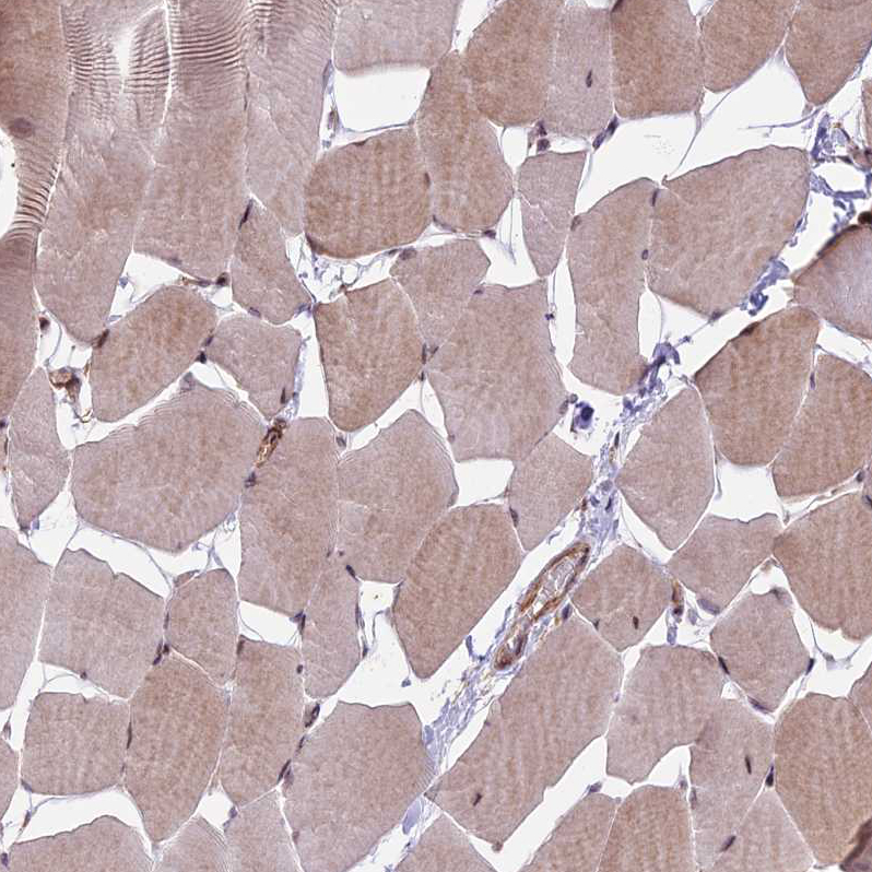 Immunohistochemical staining of human skin shows moderate cytoplasmic positivity and strong nuclear positivity in squamous epithelial cells.