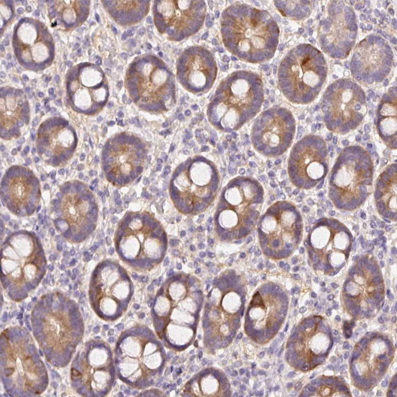 Immunohistochemical staining of human testis shows strong cytoplasmic and membranous positivity in cells in seminiferous ducts.