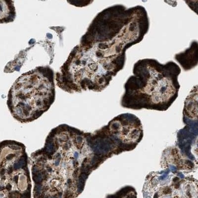 Immunohistochemical staining of human kidney, liver, lymph node and placenta using Anti-HIBADH antibody HPA021002 (A) shows similar protein distribution across tissues to independent antibody HPA019522 (B).