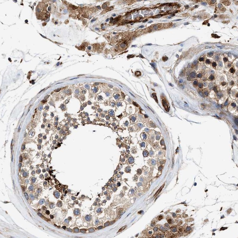 Immunohistochemistry analysis in human testis and liver tissues using Anti-HIP1 antibody. Corresponding HIP1 RNA-seq data are presented for the same tissues.