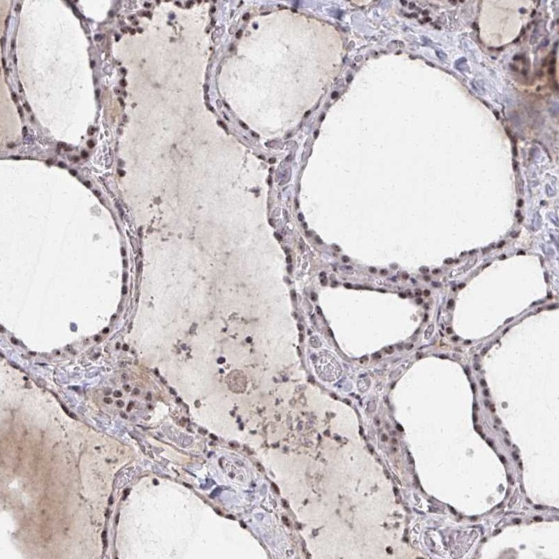 Immunohistochemistry analysis in human thyroid gland and liver tissues using Anti-HIRA antibody. Corresponding HIRA RNA-seq data are presented for the same tissues.