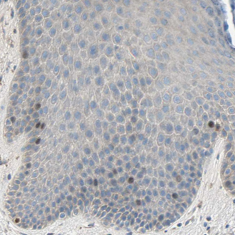 Immunohistochemical staining of human lymph node shows moderate to strong nuclear positivity in lymphoid cells.
