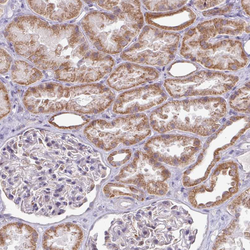 Immunohistochemical staining of human liver shows strong granular cytoplasmic positivity in hepatocytes.