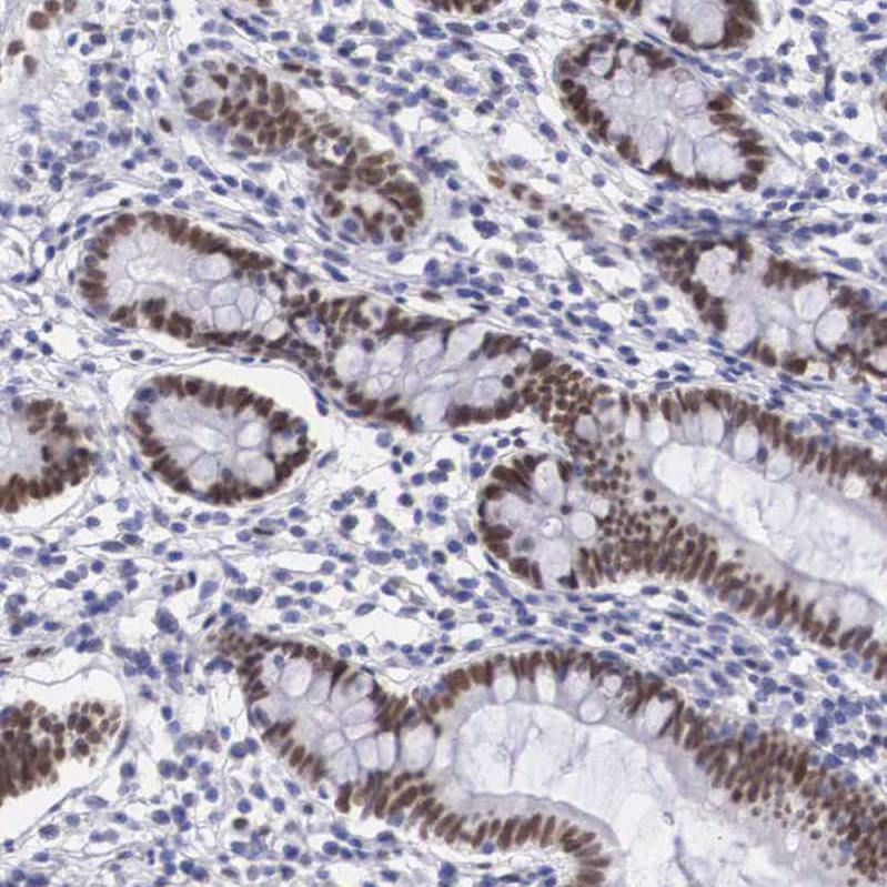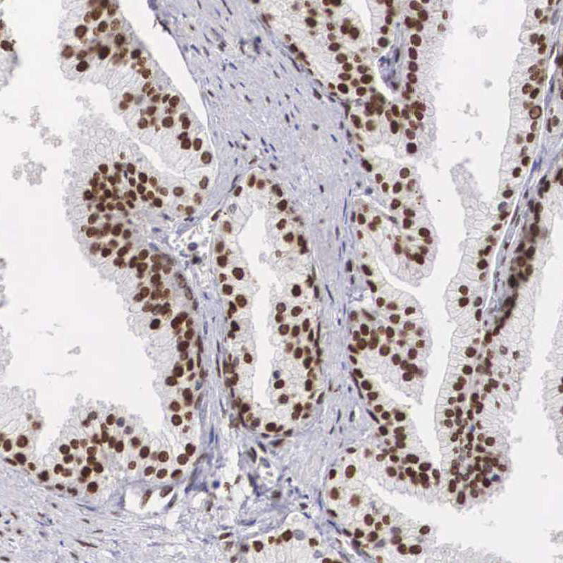 Immunohistochemical staining of human testis shows strong nuclear positivity in cells in seminiferous ducts.