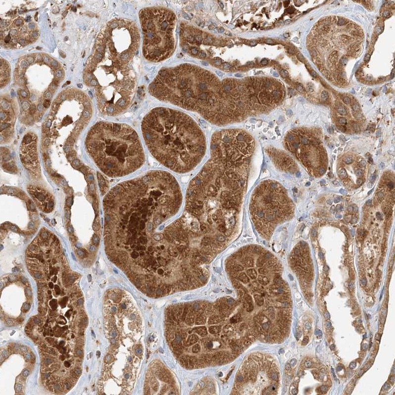 Immunohistochemical staining of human liver shows moderate cytoplasmic positivity in hepatocytes.