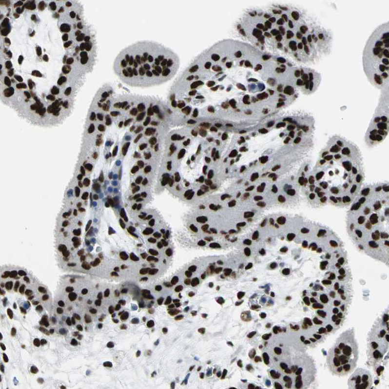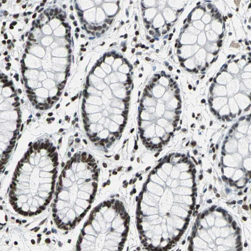 Immunohistochemical staining of human tonsil tissue shows strong nuclear positivity in non-germinal center cells and germinal center cells.