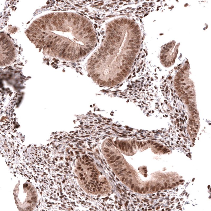 Immunohistochemical staining of human fallopian tube shows moderate nuclear positivity in glandular cells.
