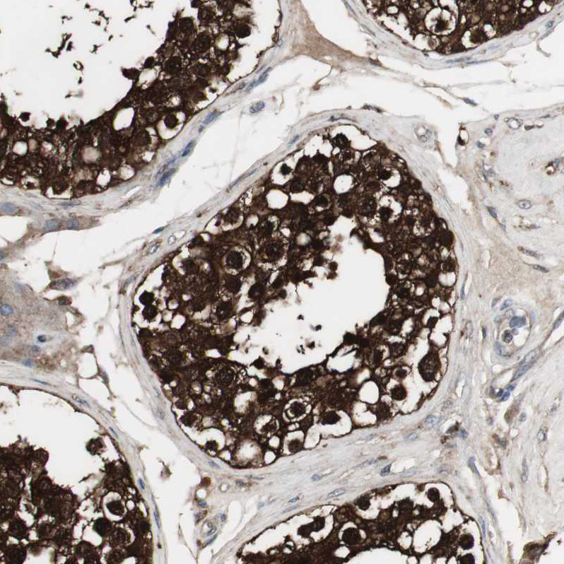 Immunohistochemistry analysis in human testis and skeletal muscle tissues using HPA006360 antibody. Corresponding HPRT1 RNA-seq data are presented for the same tissues.