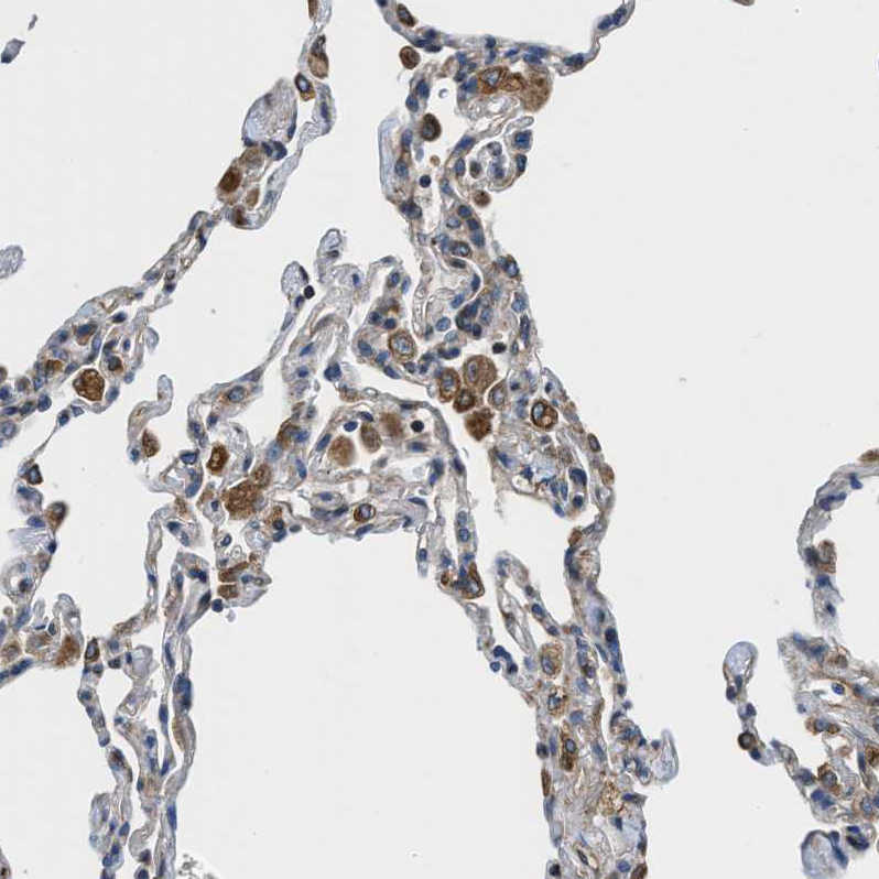 Immunohistochemical staining of human testis shows strong cytoplasmic positivity in Leydig cells.