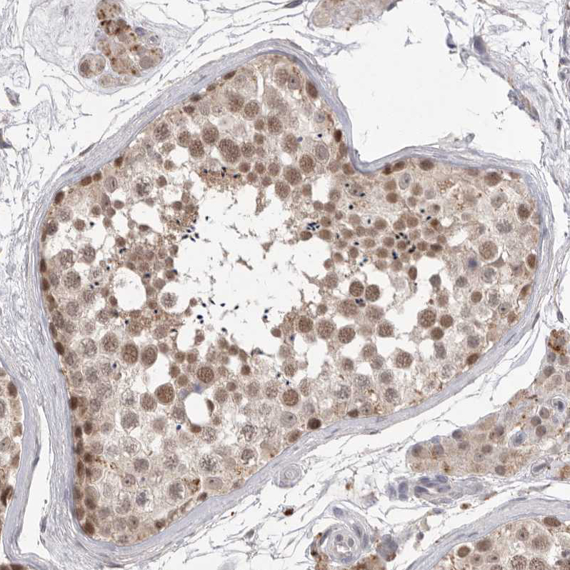 Immunohistochemical staining of human rectum shows moderate nuclear positivity in glandular cells.