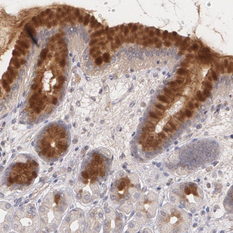 Immunohistochemistry analysis in human stomach and liver tissues using Anti-IFNGR2 antibody. Corresponding IFNGR2 RNA-seq data are presented for the same tissues.