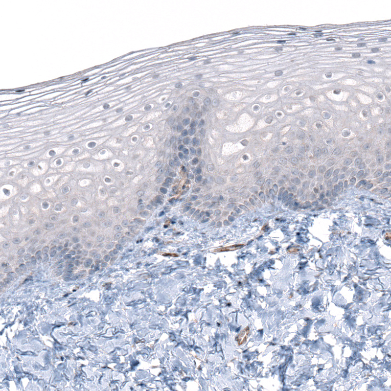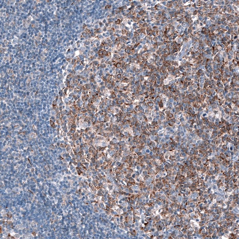 Immunohistochemical staining of human placenta shows strong cytoplasmic positivity in trophoblastic cells.