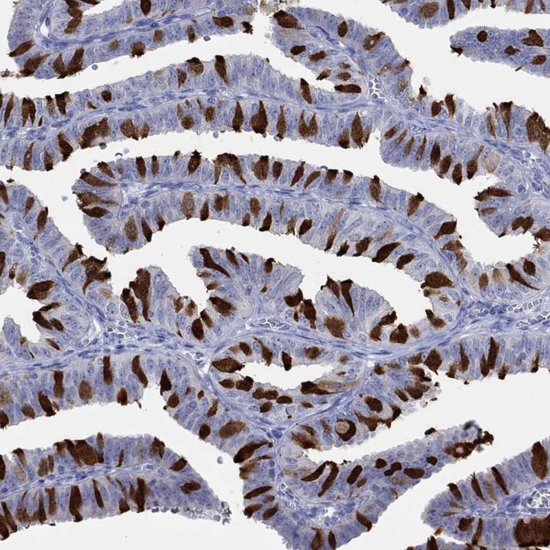 Immunohistochemical staining of human fallopian tube shows strong cytoplasmic positivity in glandular cells.
