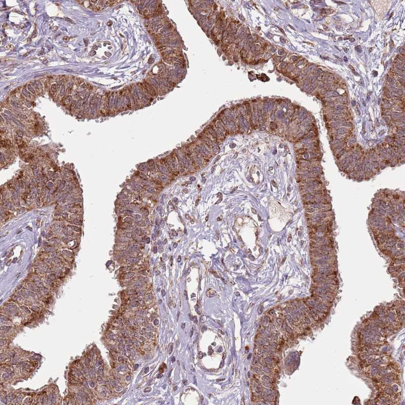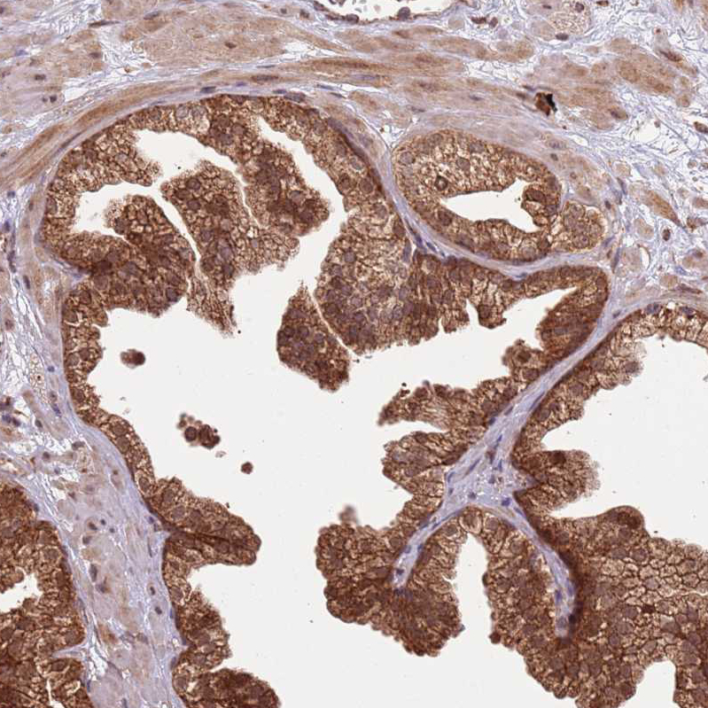 Immunohistochemical staining of human testis shows strong granular cytoplasmic positivity in cells in seminiferous ducts.