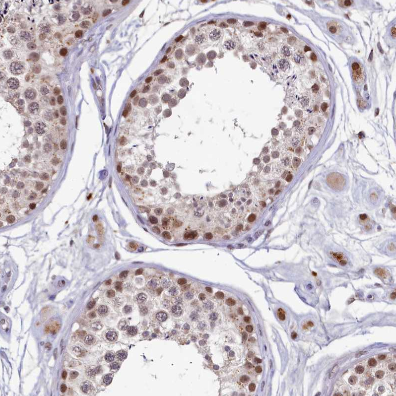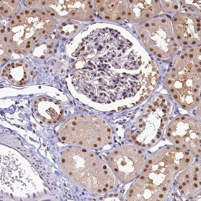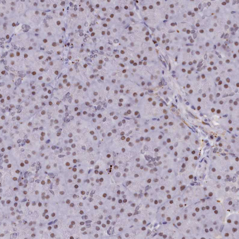 Immunohistochemical staining of human colon shows moderate nuclear positivity in glandular cells and lymphoid cells.