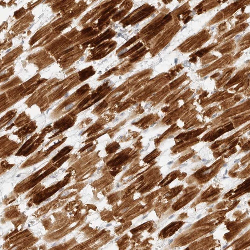 Immunohistochemical staining of human heart muscle shows strong positivity in myocytes.