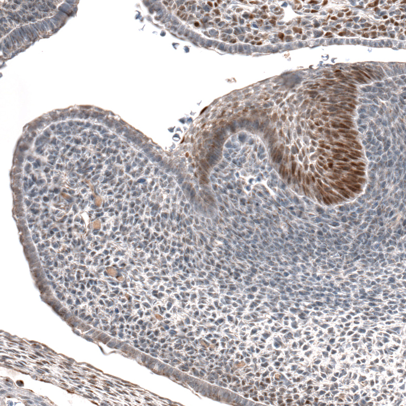 Immunohistochemical staining of mouse embryo E14 shows moderate to strong nuclear positivity in developing lung.