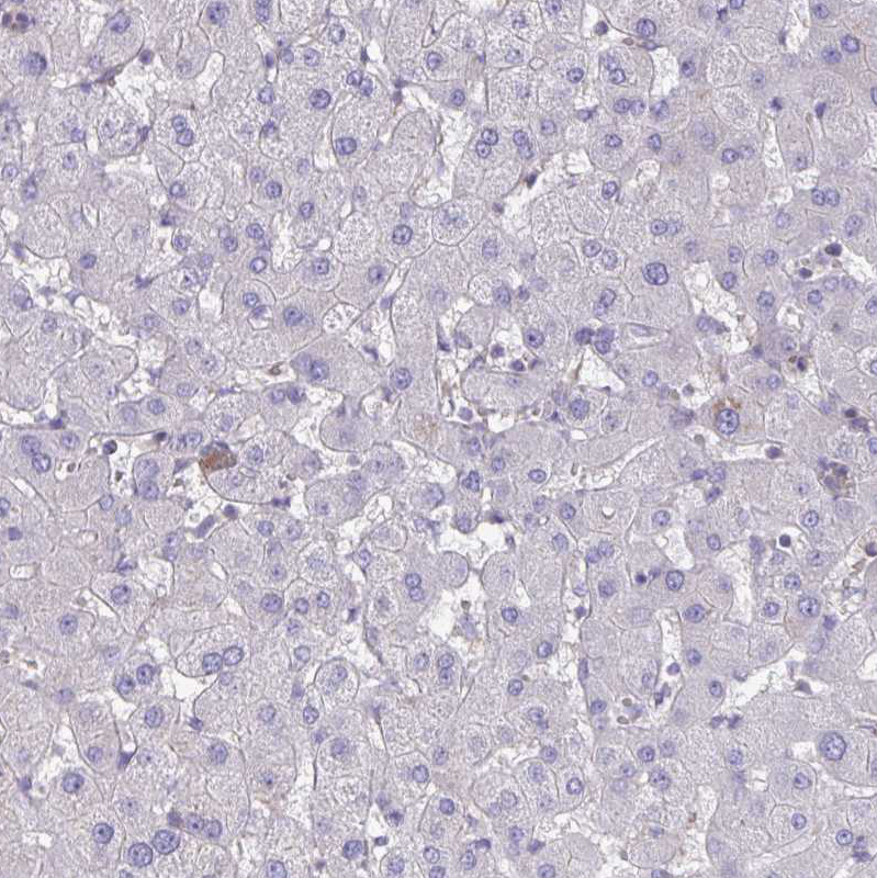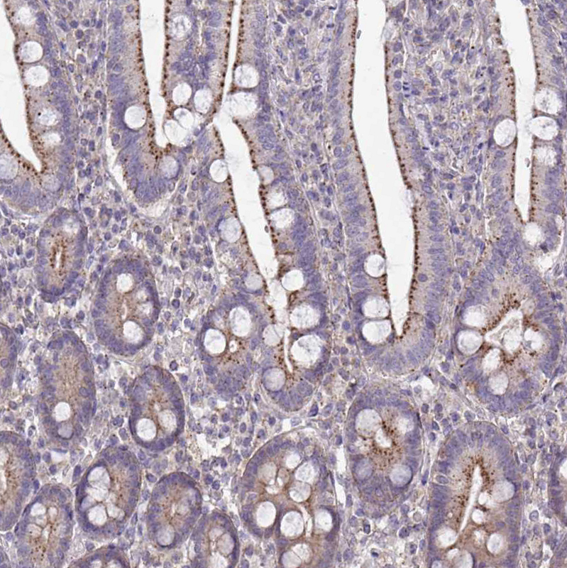 Immunohistochemical staining of human testis shows moderate to strong cytoplasmic positivity in cells in seminiferous ducts.
