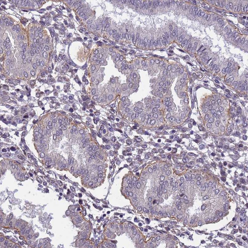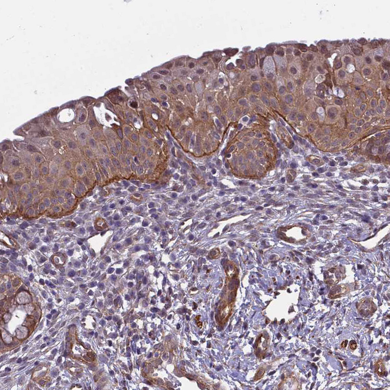Immunohistochemical staining of human skin shows moderate to strong membranous positivity in keratinocytes.