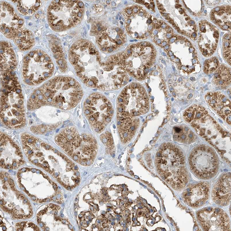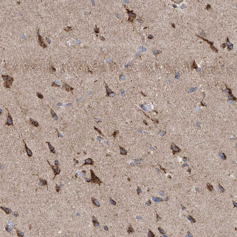 Immunohistochemical staining of human cerebellum shows strong cytoplasmic positivity in Purkinje cells.
