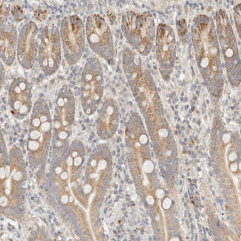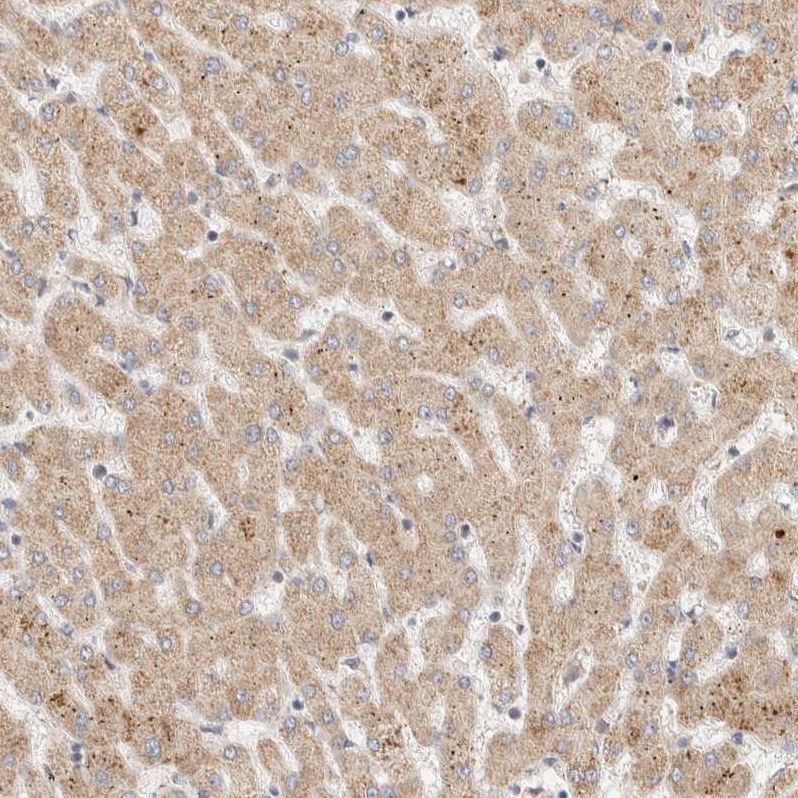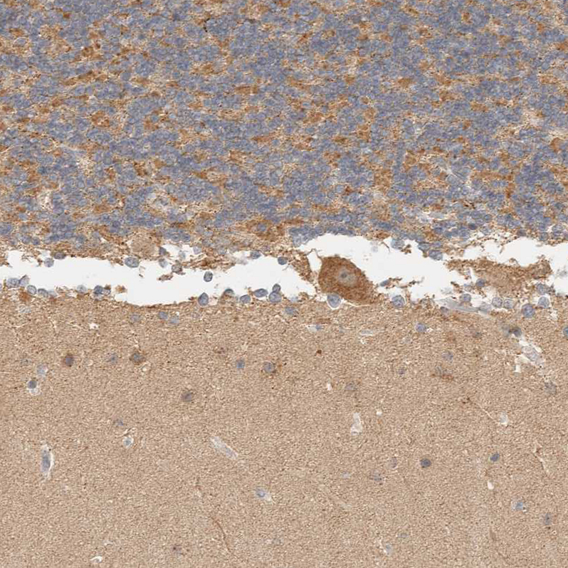 Immunohistochemical staining of human kidney shows strong granular cytoplasmic positivity in cells in tubules.