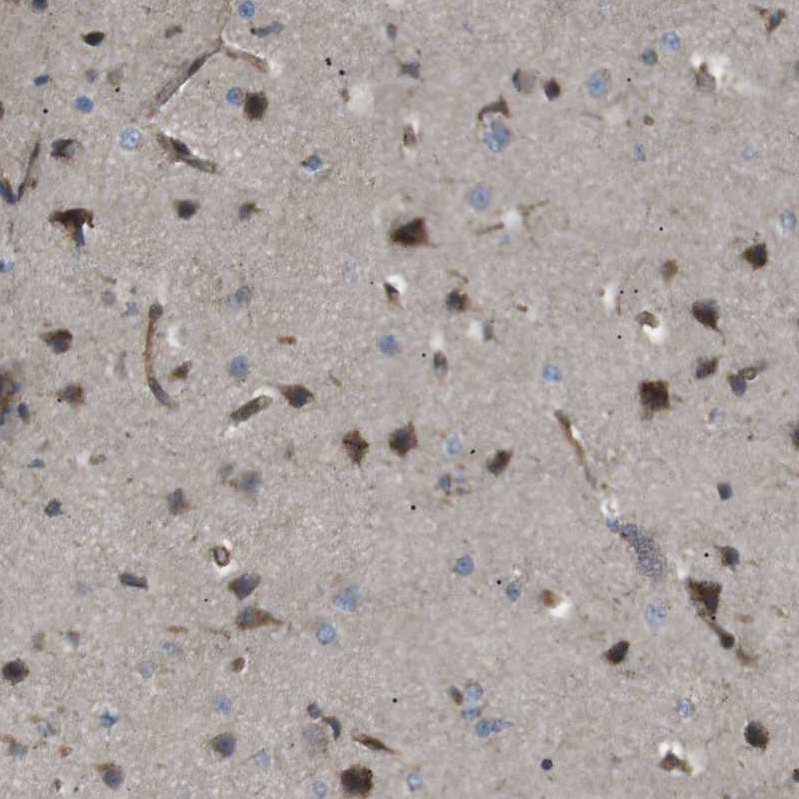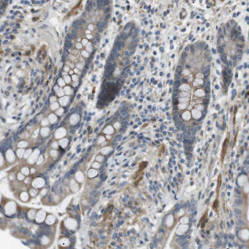 Immunohistochemical staining of human cervix shows moderate cytoplasmic positivity in squamous epithelial cells and smooth muscle cells.